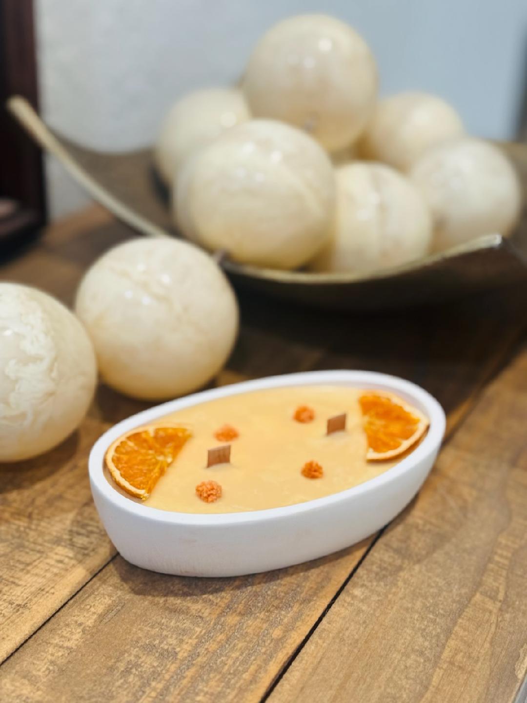 "Una vela artesanal única con esencia de Pumpkin Spice, adornada con rodajas de naranja deshidratada y delicados detalles florales. Su aroma cálido y especiado llenará tu hogar de la magia del otoño, creando un ambiente acogedor y relajante. Ideal para tardes de calma, momentos especiales o para darle un toque elegante a tu decoración."